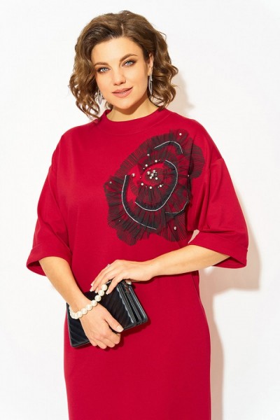 Очень лаконичное и стильное платье определённо привлечёт к себе внимание окружающих. Модель свободного «о»-образного силуэта. Левую часть плеча и груди украшает изысканная печать аппликация в виде цветка с декором из бусин и жемчуга. Платье с мягко лежащей стойкой у горловины. Рукав длиной ¾-ти, на притачной манжете на отворот. Модель слегка заужена к низу, с разно уровневым фигурным низом, оформленный обтачкой. В платье предусмотрены карманы.