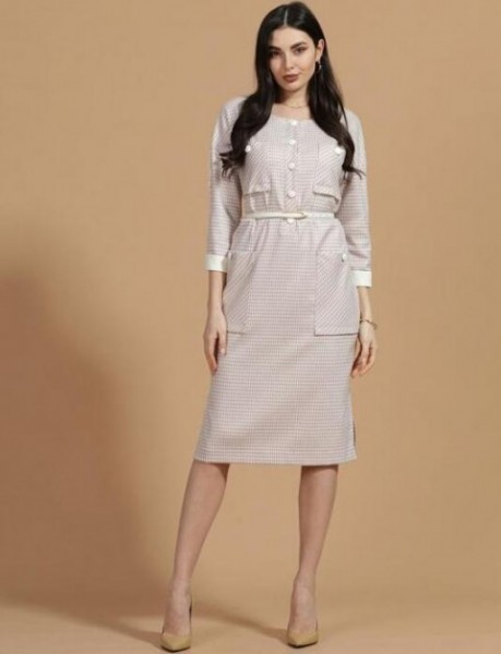 Платье женское полуприлегающего силуэта,со спущенным плечом. Перед цельный с планкой на петли-пуговицы до талии. По переду расположены накладные карманы в области груди и в области бедер. Горловина округлой фомы, в боковых швах расположены разрезы. К платью прилагается ремень.