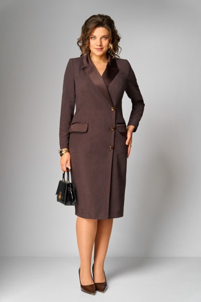 Платье женское, полуприлегающего силуэта, зауженное к низу, с двубортной застежкой (правая часть имеет слегка наклонную линию) на 3 отделочные пуговицы. На спинке средний шов, заканчивающийся шлицей и талиевые вытачки. По переду отрезной бочок, заканчивающийся в области бедер и нагрудная вытачка, в горизонтальном подрезе, в котором выполнен прорезной карман с двумя рамками и клапаном. Горловина оформлена воротником пиджачного типа. Рукав втачной, одношовный, длинный. Воротник, лацкан, клапаны и рамки кармана из атласной ткани.