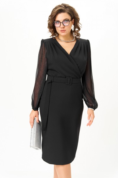 Платье женское полуприлегающего силуэта, втачного покроя рукава, выполнено из костюмной ткани с шифоновыми рукавами с металлизированной нитью. По переду отрезное по линии талии, верхняя часть, верхняя часть на подкладке, состоит из кокетки и лифа со складками, идущими на запах. Горловина «V - образной» формы. Спинка с талиевыми вытачками и средним швом, в котором разрез и застежка на тесьму-молнию. Рукав одношовный, длинный со сборкой по окату и собранный на резинку по низу. Дополнением служит пояс с пряжкой из основной ткани.