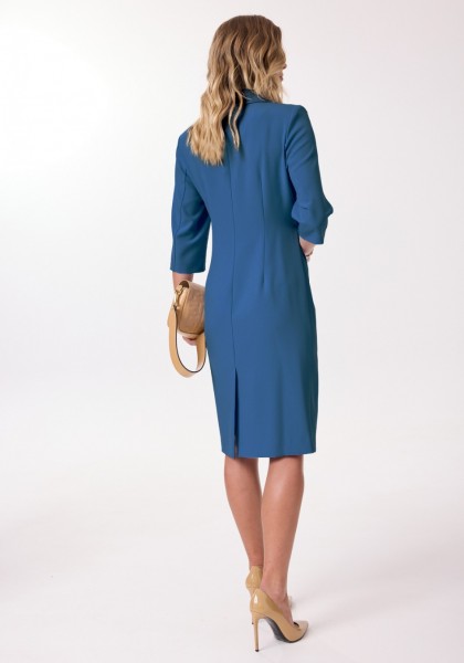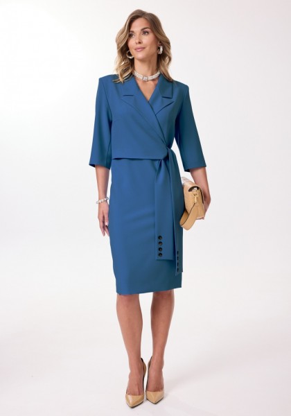 Платье полуприлегающего силуэта, выполненное из плательно-костюмной ткани, длиной миди. Одна из деталей лифа - отлетная, имитирующая образ комплекта "жакет и платье". Перед платья с нагрудными вытачками. Верхняя, жакетная часть платья завязывается на фигурный пояс, декорированный пуговицами. Спинка со средним швом и талиевыми вытачками. В нижней части среднего шва спинки обработана шлица. В левом боковом шве расположена потайная молния. Рукав втачной, двухшовный. Горловина платья оформлена воротником жакетного типа.