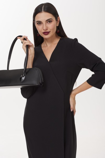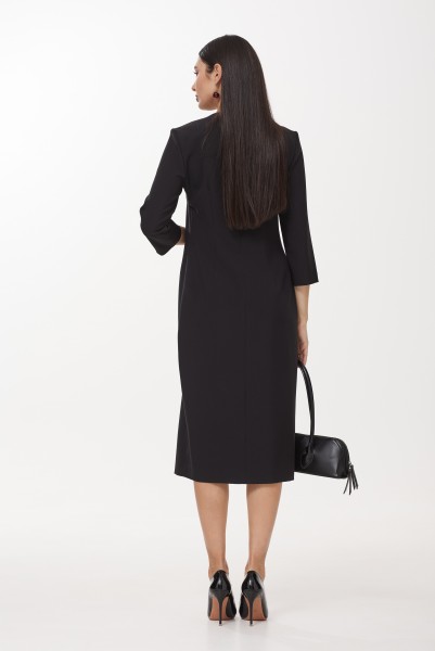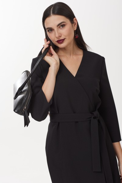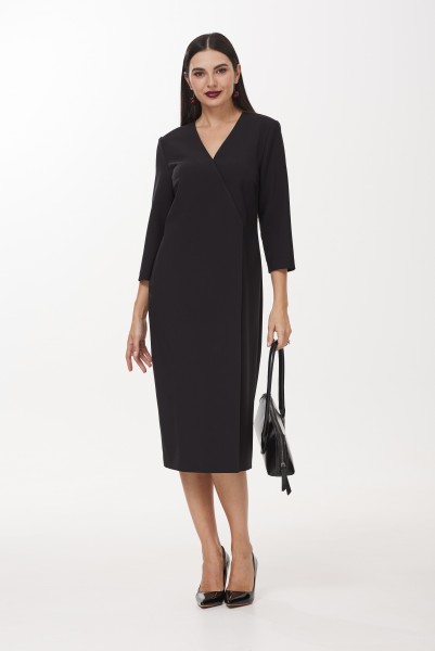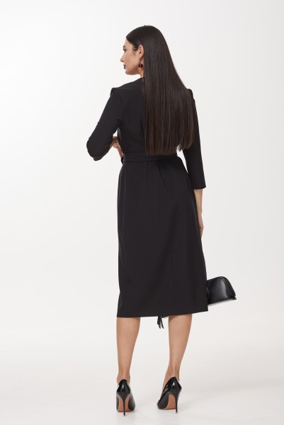 Платье полуприлегающего силуэта, выполненное из плательно-костюмной ткани, длиной миди. Перед с имитацией "платья на запах". По переду обработаны нагрудные вытачки, отлетные детали переда зафиксированы изнутри. Спинка с талиевыми вытачками и со средним швом, в который вставлена потайная молния. Рукав втачной, длиной 3/4. Горловина платья с V-образным вырезом. В комплект к платью идёт съёмный пояс из основной ткани.