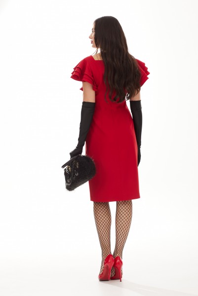 Платье женское приталенного силуэта, длиной до середины колена. Выполнено из ткани плательной группы. По переду платья расположены рельефы, идущие из линии проймы. В левом рельефе по низу расположен высокий разрез. На спинке талиевые выточки и средний шов, в котором обработана застежка на "тесьму-молнию". Рукава короткие, состоящие из трехъярусных воланов. Вырез горловины оформлен фигурным "каре".