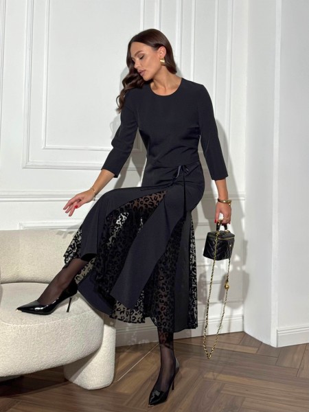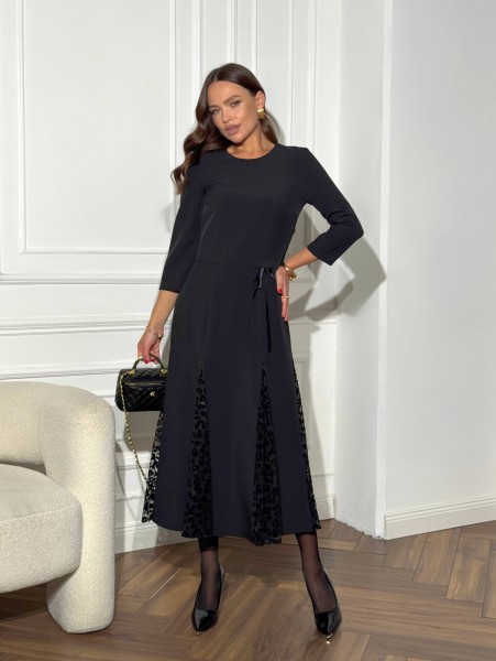 Платье полуприлегающего силуэта, отрезное по линии талии с кулисой, через которую протянут декоративный шнур.