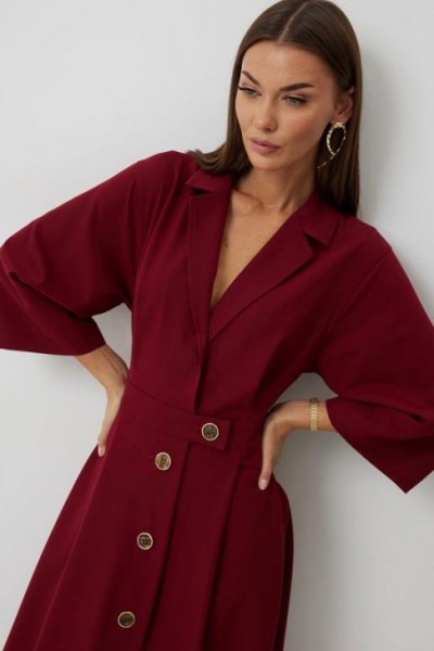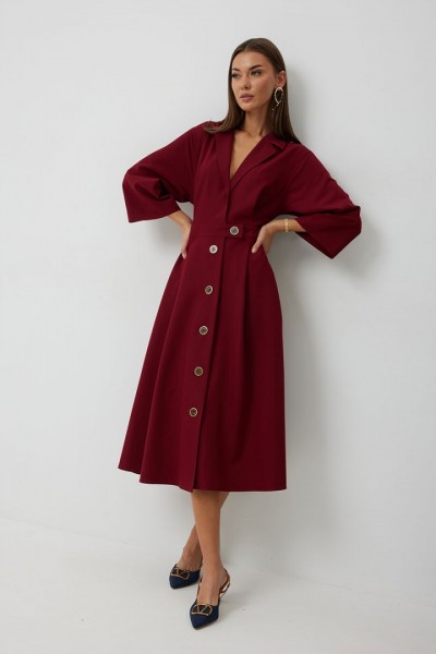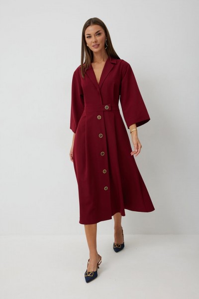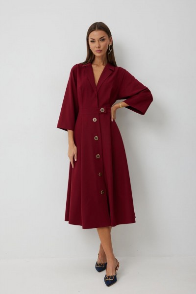 Платье женское полуприлегающего силуэта, отрезное по линии талии с застежкой по центральной части переда на декоративные пуговицы. Платье длиной до середины икры. По отрезному лифу с юбке полочки и спинки заложены складки. Лиф с юбкой соединены втачным поясом, по которому прострочена отделочная строчка. Рукав втачной прямой до середины локтя. По пройме прострочена отделочная строчка. Горловина платья обработана втачным воротником с отложными лацканами.