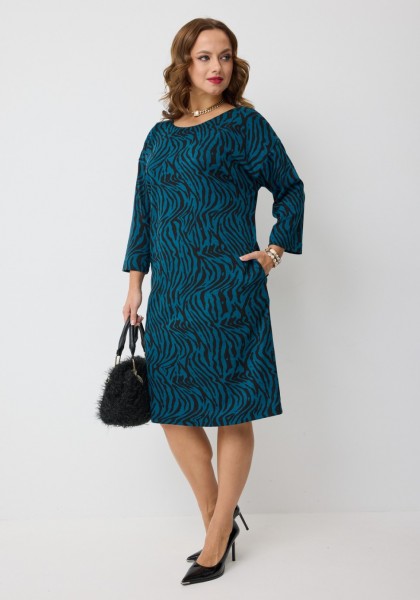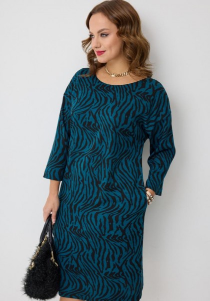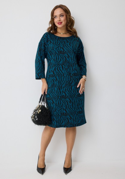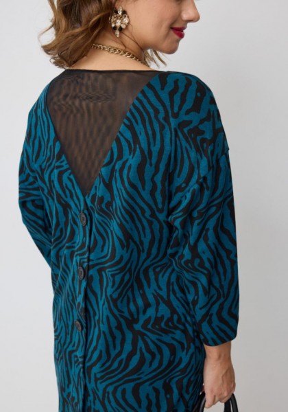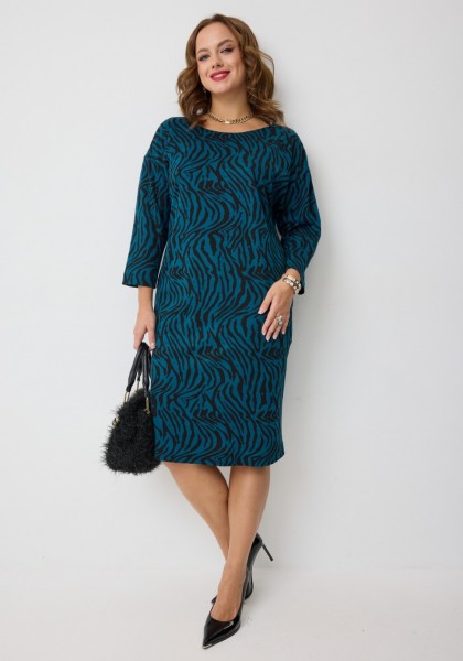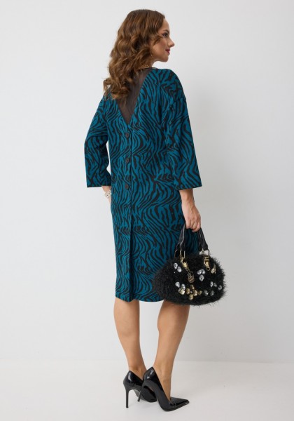 Платье полуприлегающего силуэта, длиной миди, со спущенной линией плеч, выполненное из поливискозного трикотажного полотна с анималистичным принтом. Перед с нагрудными вытачками и круглой формой горловины. Спинка с центральной складкой, имитирующей планку, с декоративными пуговицами. В верхней части спинки платья - декоративная вставка V-образной формы из двойной сетки. Рукав втачной одношовный длиной 3/4.