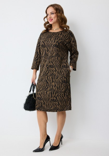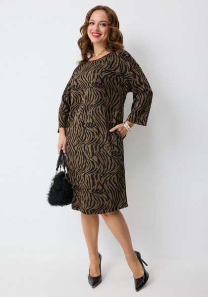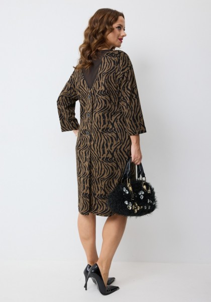 Платье полуприлегающего силуэта, длиной миди, со спущенной линией плеч, выполненное из поливискозного трикотажного полотна с анималистичным принтом. Перед с нагрудными вытачками и круглой формой горловины. Спинка с центральной складкой, имитирующей планку, с декоративными пуговицами. В верхней части спинки платья - декоративная вставка V-образной формы из двойной сетки. Рукав втачной одношовный длиной 3/4.