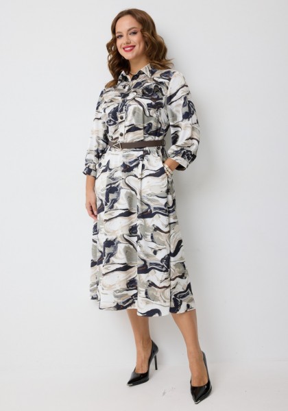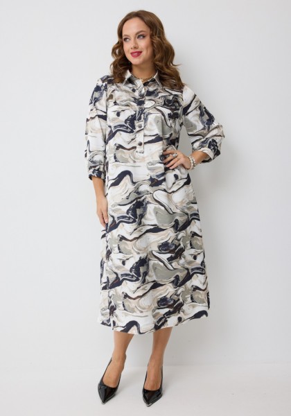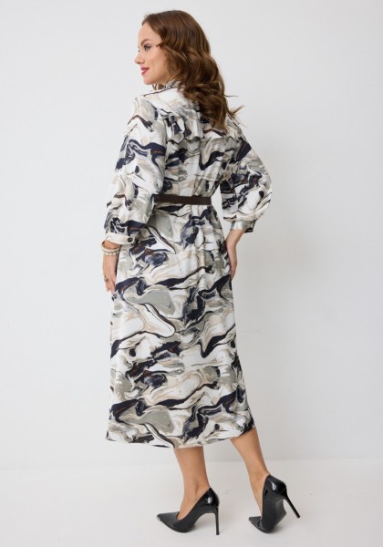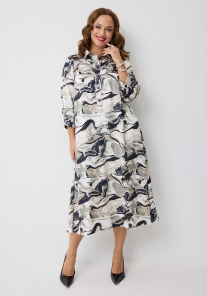 Платье А-силуэта, на подкладке, длиной мидакси, выполненное из плательной вискозы с принтом "волны". Платье на трикотажной подкладке. Горловина платья оформлена воротником рубашечного типа. Перед платья с центральной застёжкой на петли и пуговицы, расположенной до линии талии. По переду обработаны нагрудные вытачки. В верхней части переда косые встречные кокетки с декоративными воланами. В боковых швах обработаны карманы. Рукав втачной одношовный, длиной 3/4, низ рукава на притачной манжете, которая застёгивается на петлю и пуговицу. По верхней части спинки кокетка с воланом, нижняя часть - цельнокроеная.
