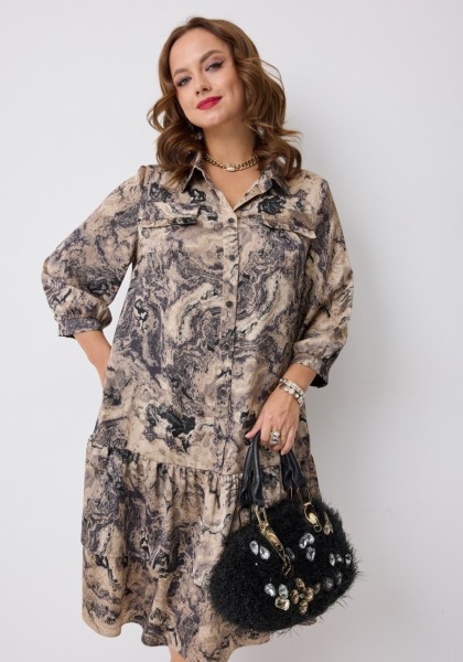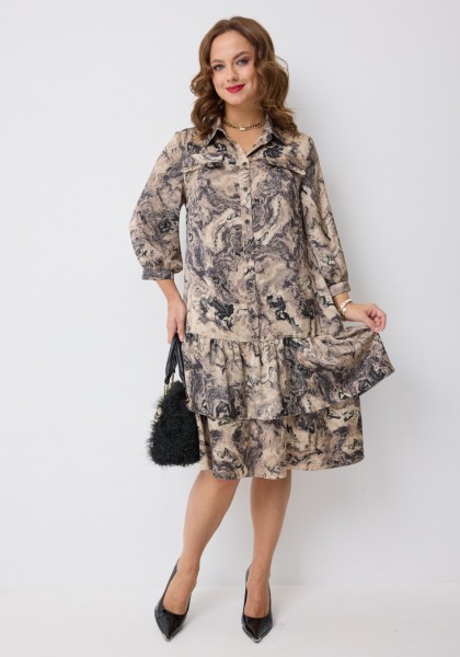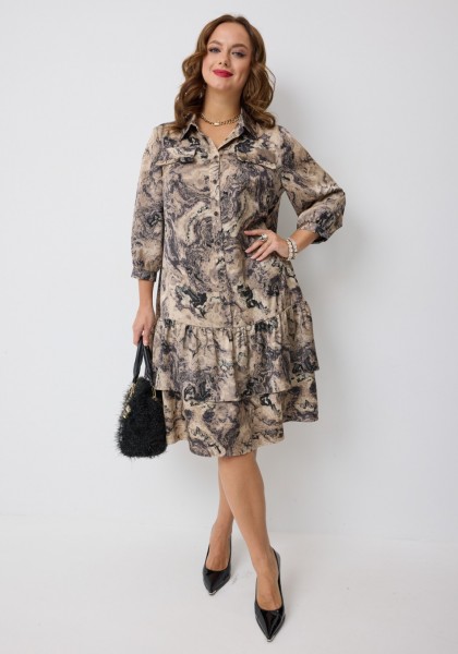 Платье, выполненное из вискозной плательной ткани, длиной миди, свободного кроя. Горловина платья оформлена воротником рубашечного типа. Перед платья с центральной застёжкой на петли и пуговицы, расположенной до линии бедер. По переду обработаны нагрудные вытачки. В области груди - настрочные декоративные клапаны, с рюшами. Нижняя часть платья состоит из двух воланов. В боковых швах обработаны карманы. Рукав втачной одношовный, длиной 3/4, низ рукава на притачной манжете, которая застёгивается на петлю пуговицу. Верхняя часть спинки цельнокроеная, нижняя, как и перед платья, состоит из 2-х воланов.