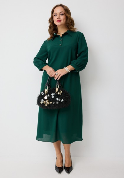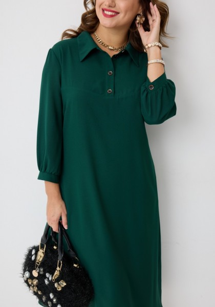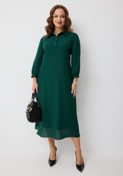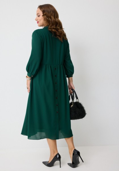 Платье А-силуэта, длиной мидакси, выполненное из креп-шифона на трикотажной подкладке. Перед состоит из фигурной кокетки и нижней части. В центральной части кокетки обработана планка с застёжкой на петли и пуговицы. Перед с нагрудными вытачками. Спинка платья состоит из верхней и нижней части. Нижняя часть - на сборке, по центру обработана планка-"обманка", с декоративными пуговицами. Горловина платья оформлена воротником рубашечного типа. Рукав втачной одношовный, по низу на сборке и притачной манжете, которая застёгивается на петлю и пуговицу. В области бедер, в боковых швах обработаны карманы.