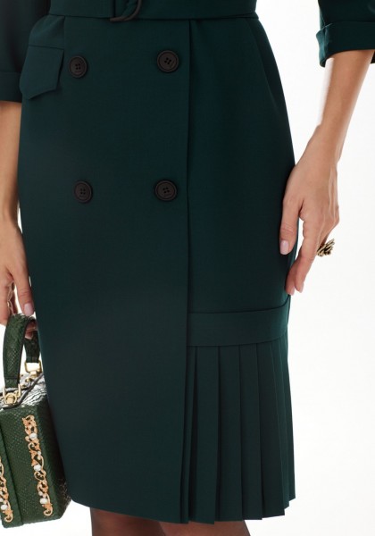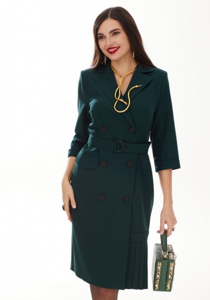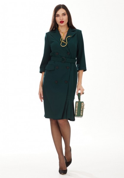 Платье женское полуприлегающего силуэта с двухбортной застёжкой на петли и пуговицы. По переду расположены нагрудные вытачки. На левой части переда - горизонтальный подрез с планкой. Нижняя часть оформлена заутюженными складками, направленными к боковому шву. По правой части переда, в области бедер, расположен горизонтальный прорезной карман с листочкой и клапаном. Спинка цельная с вертикальными талиевыми вытачками. Рукав двухшовный, длиной 3/4, с манжетой по низу рукава. Горловина платья оформлена воротником жакетного типа. В комплект к платью идёт пояс из основной ткани с декоративной пряжкой.