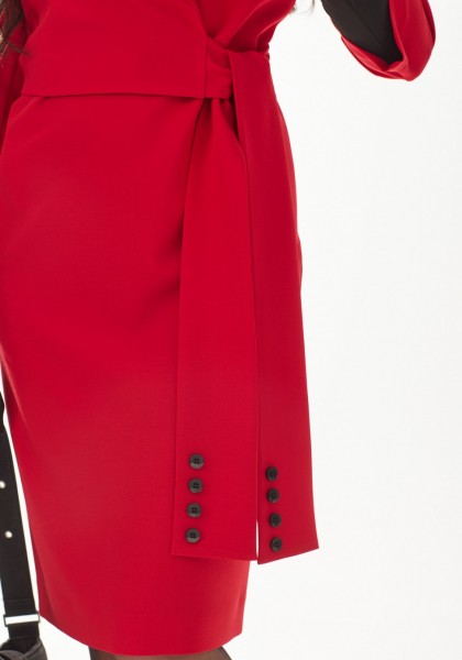 Платье полуприлегающего силуэта, выполненное из плательно-костюмной ткани, длиной миди. Одна из деталей лифа - отлетная, имитирующая образ комплекта "жакет и платье". Перед платья с нагрудными вытачками. Верхняя, жакетная часть платья завязывается на фигурный пояс, декорированный пуговицами. Спинка со средним швом и талиевыми вытачками. В нижней части среднего шва спинки обработана шлица. В левом боковом шве расположена потайная молния. Рукав втачной, двухшовный. Горловина платья оформлена воротником жакетного типа. Брошь в комплект не входит.