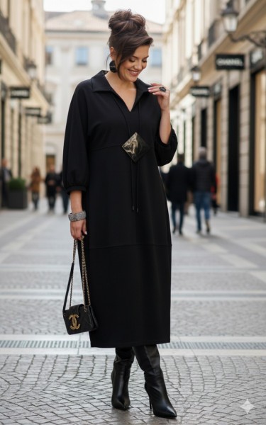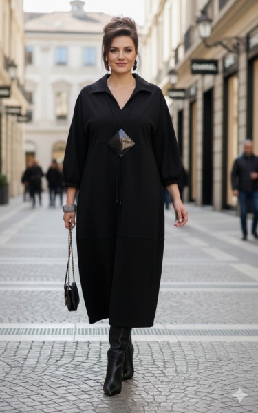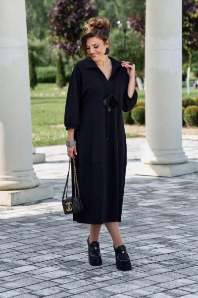 Представляем вашему вниманию элегантное платье миди в насыщенном чёрном оттенке, который актуален в любом сезоне. Выполненное из мягкой, струящейся ткани, оно обеспечивает приятные ощущения при носке и безупречную посадку. Свободный крой платья напоминающий собой форму «купола» слегка заужается к низу придает силуэту изящество и позволяет ему деликатно ниспадать по фигуре. V-образный вырез горловины, дополненный отложным воротником, придает платью классический и в то же время современный вид. Линия талии завышенная, лиф платья двойной, со средним швом. Рукав в платье цельнокроеный со сборкой на манжету, добавляют образу непринужденности и объема. Горизонтальный шов, расположенный примерно на уровне бедер, создает интересный структурный акцент. В боковых швах карманы. В качестве дополнительного декоративного элемента в комплекте с платьем идёт украшение ручной работы.
