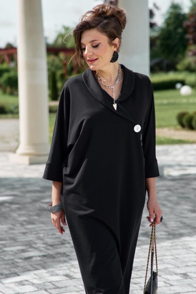 Интересный крой платья и пластические свойства трикотажного полотна помогут скрыть недостатки фигуры и создать идеальный образ. Платье свободного силуэта, заужается к низу. Горловина в платье открытая, с ассиметричным отложным воротником переходящим в подрез по переду платья. Спинка со средним швом. Рукав в платье по форме «летучая мышь» с притачной манжетой по низу. В качестве главного акцента платья, который приковывает взгляды, являются пришивные декоративные пуговицы контрастного цвета и разных размеров. Обращаем Ваше внимание, что фурнитура может незначительно отличаться от фото.