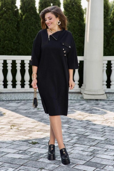 Платье свободного силуэта, горловина ассиметричной формы. По переду платья фигурная кокетка с функциональной молнией, нагрудный карман с клапаном и декоративной отделкой в виде металлической фурнитуры. Линия плеча спущенная, рукав втачной, длиной ¾, широкий к низу. Спинка в платье со средним швом заканчивающимся разрезом. В боковых швах платья карманы.