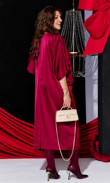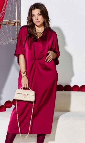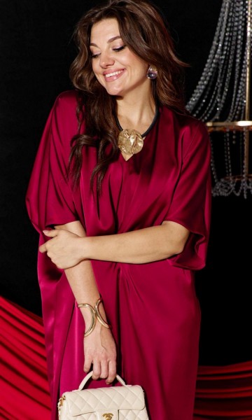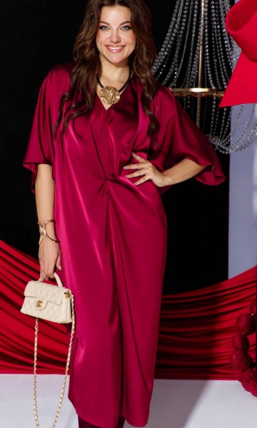 Это платье — олицетворение силы и изящности: ярко, но не кричаще. Уверенный, волнующий наряд для торжественных мероприятий и важных встреч. Силуэт «летучая мышь» мягко обтекает фигуру, создавая плавный переход между линией плеч и линией талии, затем свободно распускается по бокам, позволяя ткани играть волной при каждом движении. Вырез горловины V-образной формы подчёркивает изящную шею, а рукава добавляют образу лёгкую драматичность и женственность. По переду платья средний шов, с застроченной складкой выше уровня талии переходящую в складку по плечу. Спинка в платье со средним швом с разрезом от низа. Рукав в платье цельнокроеный со щеловидным вырезом проймы.