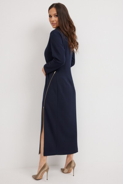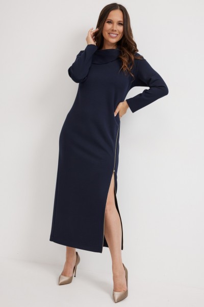 Элегантное и стильное платье миди полуприлегающего силуэта. Выполнено из приятного к телу комфортного гладкого трикотажного полотна. Рукав втачной, полной длины. Украшением платья являются функциональные тесьмы молнии. С их помощью можно стильно уложить воротник и отрегулировать вырез платья. Из лаконичного базового платье легко трансформируется в стильное и сексуальное. Длина платья от плечевого шва 127см. Длина рукава 60см.