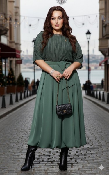 Невероятно красивое и элегантное платье отвечает всем требованиям вечернего наряда! Сочетание тканей разных фактур и дизайнов в одной модели - тренд сезона. Это элегантное платье миди состоит из двух частей, создающих впечатление комплекта. Верхняя часть платья выполнена из плиссированной ткани, что придаёт ему текстурный и динамичный вид, а юбка с атласным блеском придаёт изделию нарядность, гармонично дополняющего верх. Высокая талия юбки визуально удлиняет фигуру. Общий ансамбль выглядит изысканно и подходит как для повседневных, так и для более официальных мероприятий. Сочетание различных фактур и оттенков зелёного создаёт глубокий и сложный образ. Дополнительные детали, такие как золотые украшения и туфли с шипами, придают платью особый шарм. Платье приталенного силуэта, с округлой формой горловины, рукав цельнокроенный, длинной ¾. В плечевом шве платья декоративная вставка рюши. Лиф платья на подкладке. Пояс в платье притачной со вставкой резинки по спинке, с застроченными складками от пояса по юбке платья. Юбка в платье «балон», на подкладке. Пояс в платье декорирован бантом в виде съемной броши.