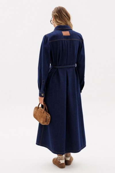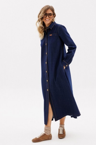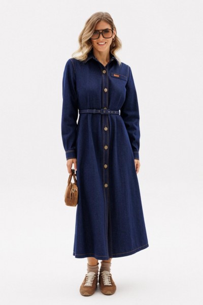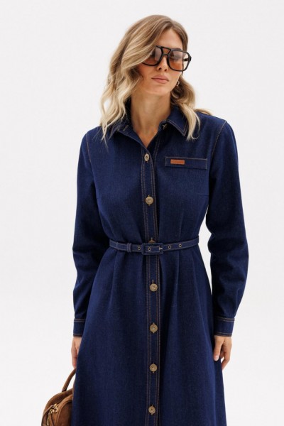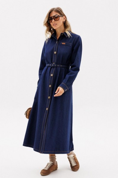 Платье выполнено из джинса. Платье рубашечного силуэта, длиной миди. Застежка спереди на металлические пробивные пуговицы. На спинке кокетка и встречная складка от нее. Воротник стояче-отложной с отрезной стойкой. Рукав втачной, одношовный, с прорезью и складкой по низу. Низ рукава на манжете, застегивающейся на пуговицу. В боковых швах карманы. Платье декорировано нашивками по переду и спинке. Длина платья: р.42-46 -133 см, р.48-52 - 134,5 см. Длина рукава: р.42-46 - 64 см, р.48-52 - 65 см.