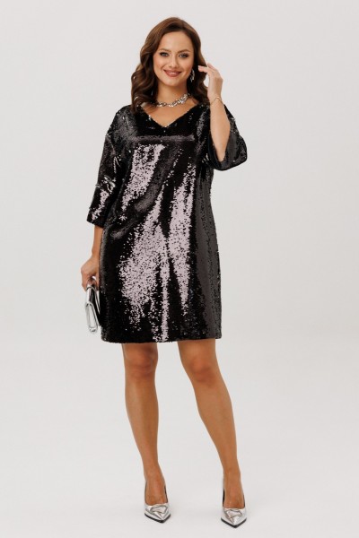 Нарядное женское платье свободного силуэта со спущенной линией плеча, выполнено из плательной ткани с пайетками (не тянется). Перед и спинка – цельные. Горловина по переду V-образной формы, по спинке – округлой формы, в вырез которой вставлен декоративный бант из шифона. Рукава втачные, одношовные. Платье на подкладке.