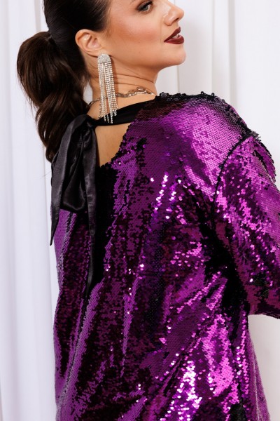 Нарядное женское платье свободного силуэта со спущенной линией плеча, выполнено из плательной ткани с пайетками (не тянется). Перед и спинка – цельные. Горловина по переду V-образной формы, по спинке – округлой формы, в вырез которой вставлен декоративный бант из шифона. Рукава втачные, одношовные. Платье на подкладке.