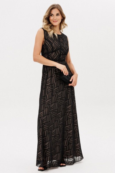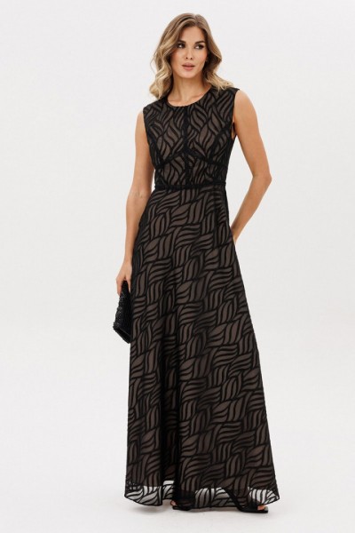 Платье выполнено из шифона с жаккардовым рисунком. Платье Х-образного силуэта, отрезное по линии талии, длиной миди. Спереди средний шов и горизонтальный подрез. Застежка на потайную молнию сзади в среднем шве спинки и юбки. Горловина округлой формы. Юбка расширена к низу и выкроена по косой. Платье декорировано настрочной тесьмой по всем резным линиям лифа и линии талии. Платье на отлетной по низу подккладке телесного цвета.