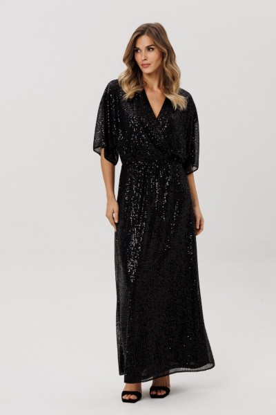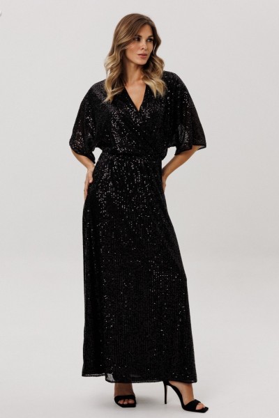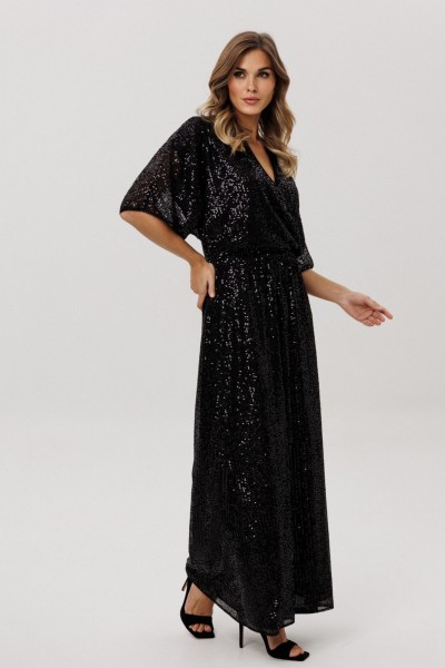 Платье выполнено из трикотажного полотна в пайетки. Платье X-образного силуэта, длиной миди, отрезное по линии талии. Лиф покроя кимоно. Перед выполнен на запах. Горловина V-образной формы. Переднее и заднее полотнище цельные и расширенные к низу. По линии талии эластичная тесьма. Платье на отлетной по низу трикотажной подкладке.