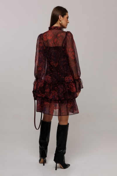 Платье шифоновое А-силуэта. Втачной длинный рукав со сборкой по окату и внизу на завязке. Полочка и спинка с притачными слегка присборенным воланом с рюшей. Воротник стойка-рюша и вырезом каплей по переду на завязке. Платье на подкладке.