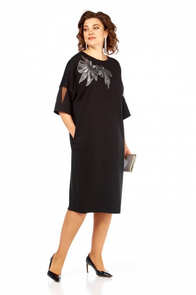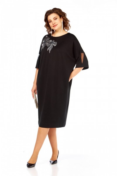 Платье женское нарядное, изготовлено из трикотажного полотна. Горловина круглой формы. На полочке дизайнерская вышивка. Спинка со средним швом и декоративным вырезом с сеткой вверху. Рукава спущенные, длиной ¾ со вставкой из сетки.