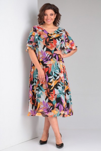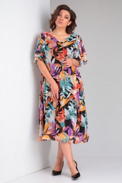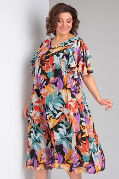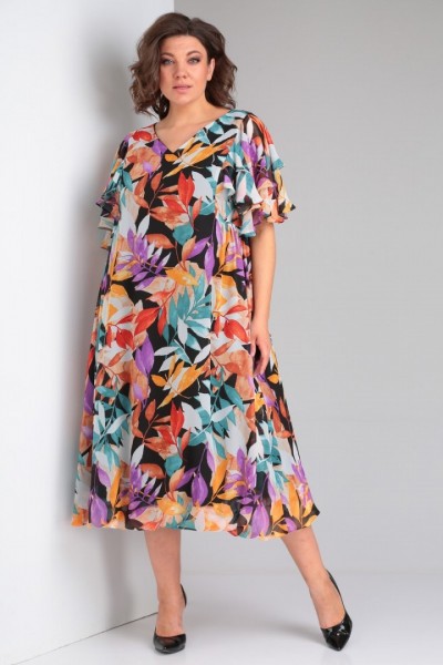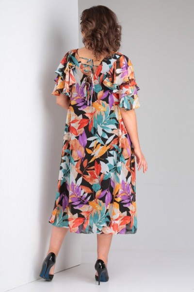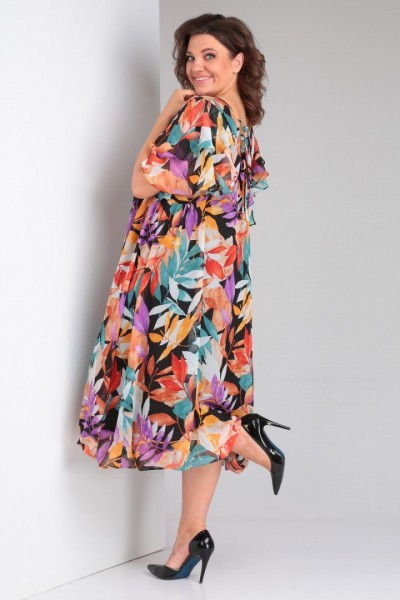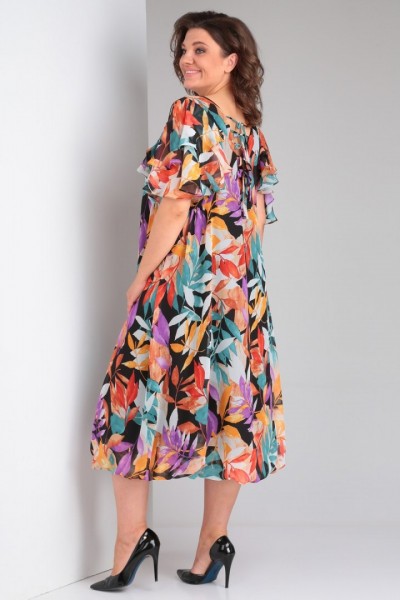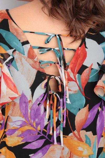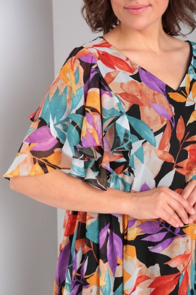 По полочке и спинке V-образный вырез, который на спинке украшен завязкми. Двойной волан имитирует рукав. По бокам платья подрезы на небольшой сборке. Шифон, пришитый к подкладке, создает снизу красивый объем. Платье на текстильной вискозной подкладке.
