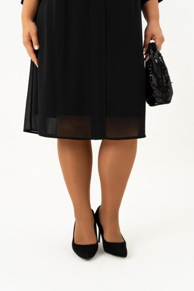 Нарядно повседневное, универсальное, элегантное черное платье с рукавом длиной ¾ на манжете и отдельным подкладом поможет Вам в создании абсолютно разных образов. Платье имеет классический прямой крой с бантовыми складками по переду и по спинке, которые добавляют романтичность и элегантность. Платье подойдет как высоким, так и невысоким женщинам, благодаря своей миди длине. Верхнее платье выполнено из шифона, горловина декорирована пуговицами. Нижнее платье из ткани "масло" на бретелях. Это платье Вы можете легко использовать как вечернее, платье для прогулки или на свидание, на день рождения или клуб, для фотосессии или романтического вечера. Такое платье будет уместно в любом гардеробе. Длина изделия (см): 106 Длина рукава (см): 47
