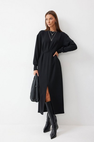 Платье полуприлегающего силуэта из трикотажного полотна. Горловина округлая. Рукав со спущенной линией плеча по низу манжета. Платье отрезное по линии талии. По переду на талии складки. В боковом шве функциональные карманы. В центральном шве юбки разрез.