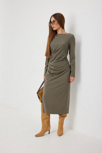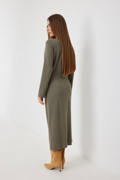 Платье женское из приятной трикотажной ткани на подкладке. Рукав длинный, одношовный. По спинке средний шов и талевые вытачки, что создает приталенный силуэт. Драпировка и сборка на животе корректирует фигуру подчеркивая женственность. Разрез по ноге добавляет игривости, делая образ более динамичным.