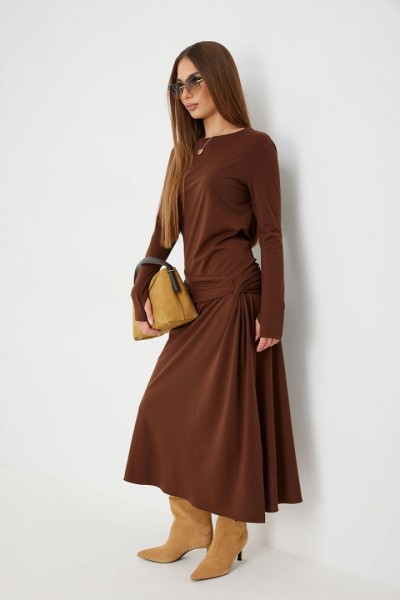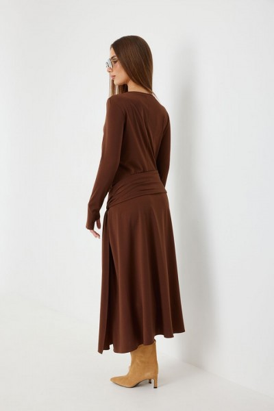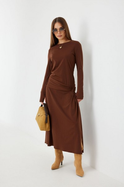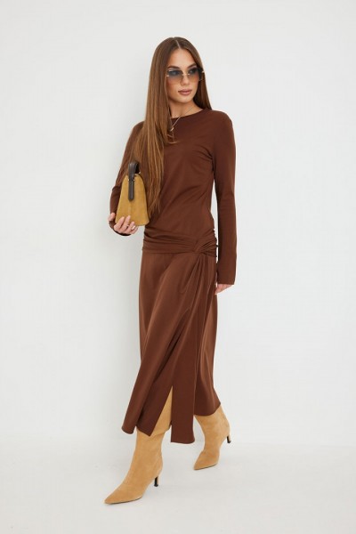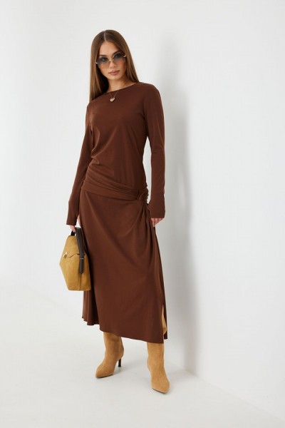 Платье женское прилегающего силуэта, длиной миди, с подрезом и интересной драпировкой в области чуть ниже талии по переду, юбка, расширенная книзу. Горловина обработана бейкой. Рукав втачной, узкий.