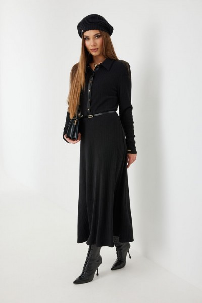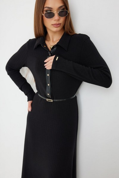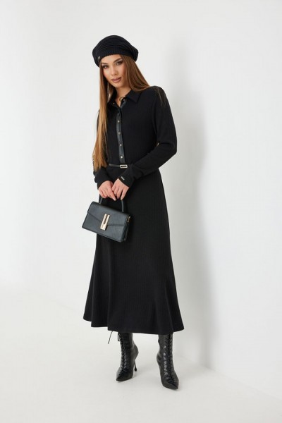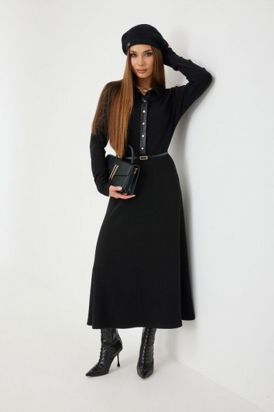 Платье трикотажное прилегающего силуэта длины «макси» расширенное к низу. По талии подрез, нижняя часть платья на подкладке. Втачной рукав полной длины, зауженный к низу. По переду застежка на планку из кожи с кнопками, по горловине отложной воротник.