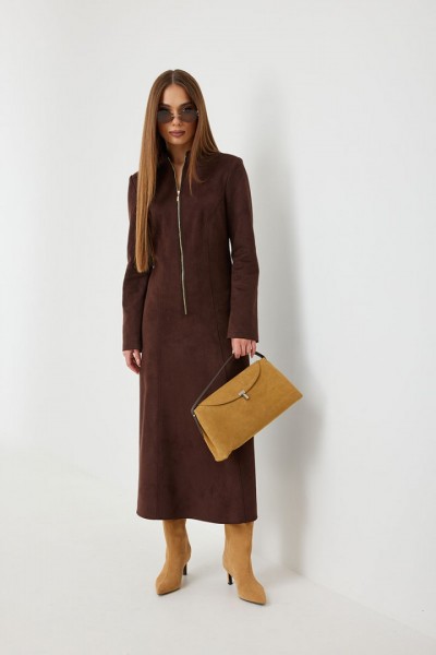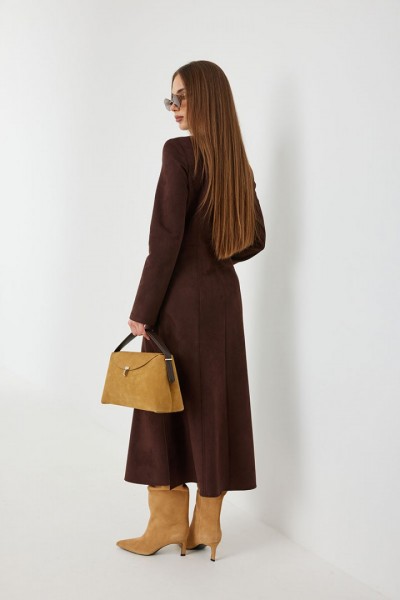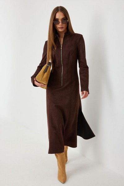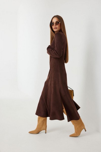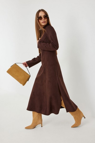 Платье женское полуприлегающего силуэта, из ткани под замшу, длиной миди, с высокими разрезами