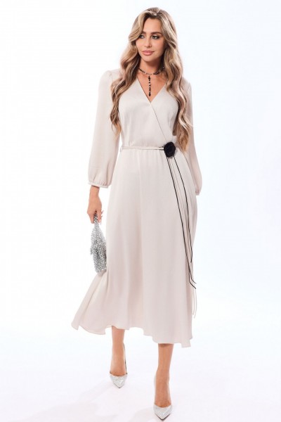 Платье, без воротника, без застежки, отрезное по линии талии. Лиф переда с запахом. Талия собрана на резинку. Верхняя часть спинки с талиевыми вытачками. Нижняя часть платья расширена к низу. Рукав втачной, 3/4, с манжетой, присборенной на резинку. Платье со съемным декоративны поясом из основной ткани и декоративным цветком на поясе.