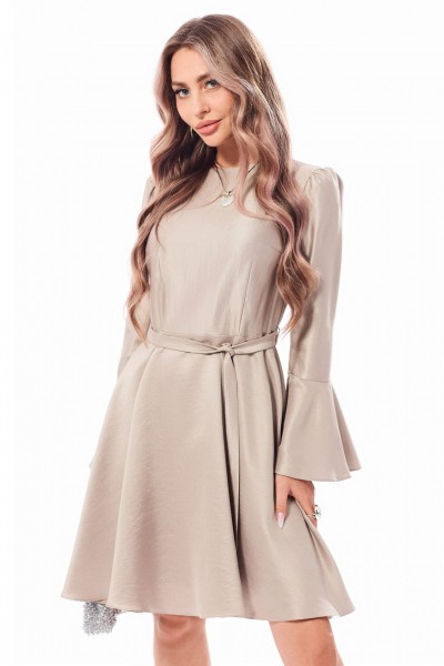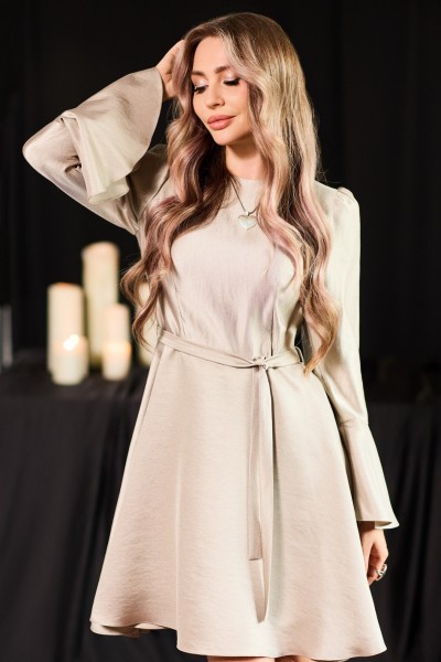 Платье без воротника, с круглым вырезом горловины, застежкой на потайную молнию в среднем шве спинки. Платье отрезное по линии талии. Лиф переда с талиевыми и нагрудными вытачками. Нижняя часть платья расклешенная. Спинка со средним швом, талиевыми вытачками. Рукав втачной, длинный, с отрезной манжетой. Окат рукава со сборкой. Манжеты расширенные к низу. Платье со съемным поясом. На талии расположены шлевки для съемного пояса.