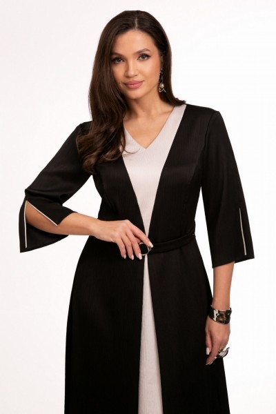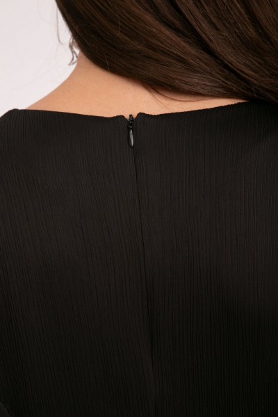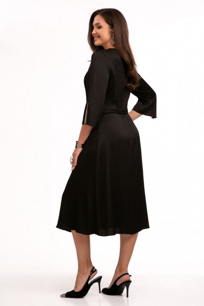Платье без воротника, с фигурным вырезом горловины, застежкой на потайную молнию в среднем шве спинки. Платье отрезное по линии талии. Верхняя часть переда с рельефными швами, выходящими из плеча и из проймы. Нижняя часть переда со встречной складкой по центру. Спинка со средним швом, талиевыми вытачками. Нижняя часть платья расширенная к низу. Рукав втачной, 3/4, с разрезом по верхнему шву и кантом в разрезе. Платье со съемным поясом.