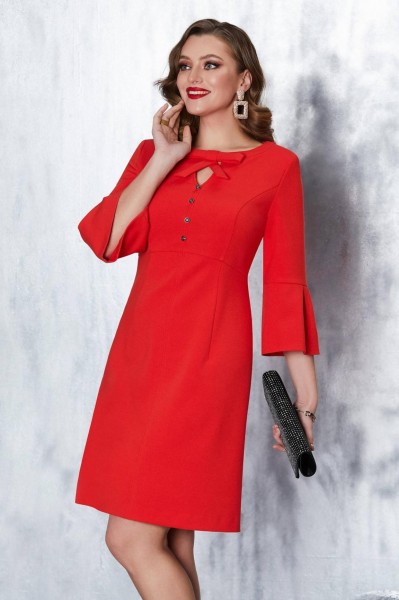 Платье с округлым вырезом горловины, отрезное выше линии талии. Перед с бантом, декоративными пуговицами в верхней части, средним швом. Спинка с потайной молнией в средним швом, рельефами до горизонтального подреза и талиевыми вытачками. Рукава втачные, с отрезной деталью по низу.