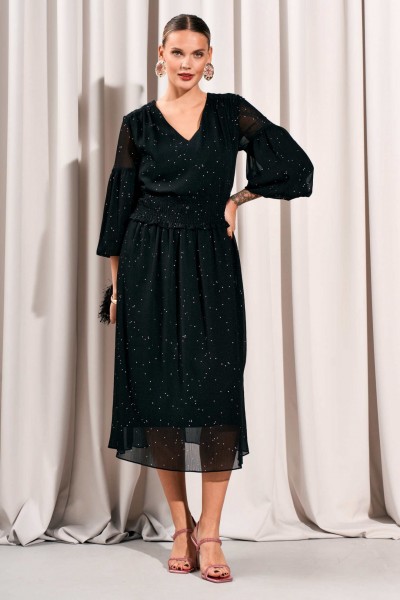 Платье с V- образным вырезом горловины и отрезной деталью собранной на венгерку по талии. Перед с кокеткой. Рукава втачные, состоящие из двух частей. Нижняя часть со сборкой и на подкладке. Платье на отлетной по низу подкладке.