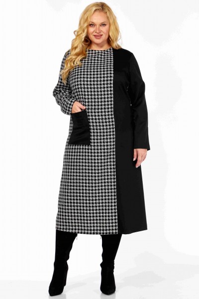 Геометрия стиля: Оригинальный дизайн с геометрическим разделением на черно-белую ""гусиную лапку"" и глубокий черный цвет – это игра контрастов, которая привлекает внимание и подчеркивает вашу индивидуальность. Вертикальные линии визуально стройнят фигуру, а продуманный крой обеспечивает идеальную посадку.