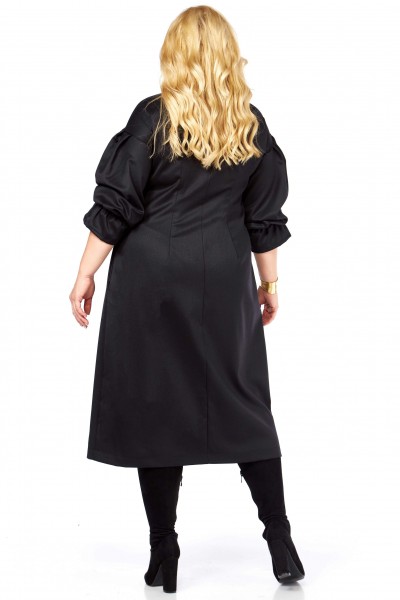 Игра акцентов и пропорций: Дизайн платья с двубортной застежкой и V-образным вырезом визуально стройнит силуэт и подчеркивает линию шеи. Рукава-фонарики добавляют нотку романтики и ретро-шика, а золотистые пуговицы – это яркий акцент, привлекающий внимание и добавляющий образу изысканности.