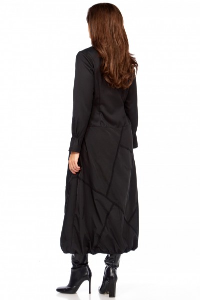 • Силуэт: Прямой, слегка расширяющийся к низу. Модель предполагает свободную посадку по фигуре. Нижняя часть платья имеет сложный крой, создающий эффект ""баллона"" или асимметричного многослойного объема.