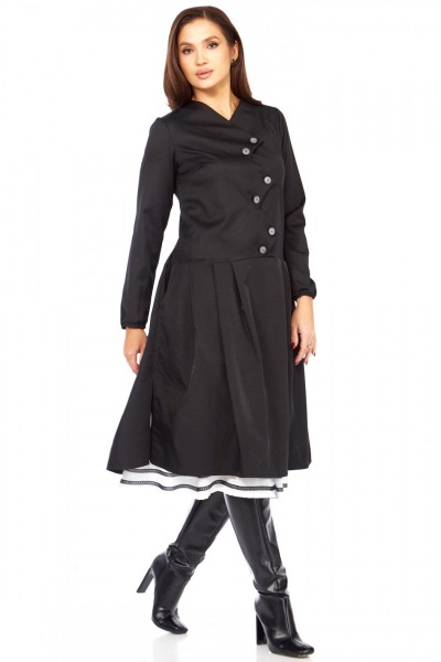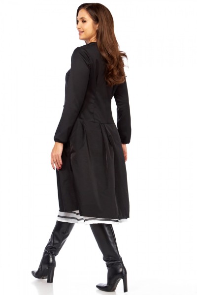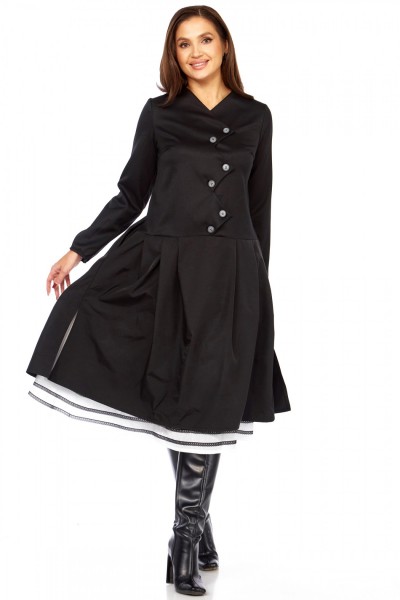 Это не просто платье, это стильный дуэт в одном флаконе, искусно имитирующий многослойный комплект. Глубокий черный цвет верхнего платья с приталенным лифом и изящными складками на юбке создает утонченный силуэт. А высокие боковые разрезы игриво открывают взгляду контрастную белую юбку-компаньон, украшенную графичными черным кружевом по низу. Этот эффект — настоящий магнит для взглядов!