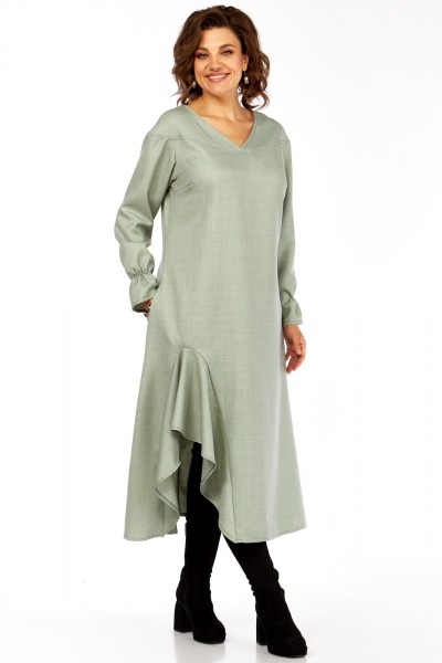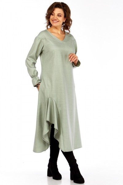 • Основная особенность: Асимметричная объемная драпировка (волан) в левой нижней части подола. Эта деталь выполнена из того же материала, создавая эффект динамичного, сложенного элемента, который придает платью уникальный архитектурный вид.