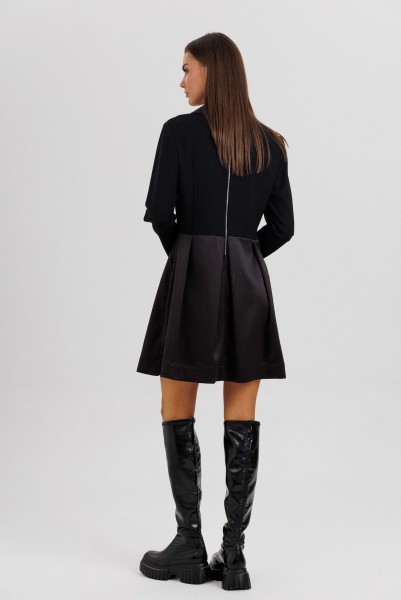 Лиф платья выполнен с талиевыми и нагрудной вытачкой, обеспечивая идеальную посадку, а юбка из гладкого атласа с мягкими складками создаёт лёгкий объём и женственный силуэт. На спинке — застёжка на отделочную молнию, добавляющая современный штрих.