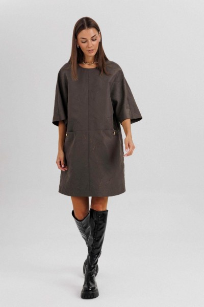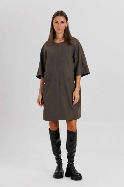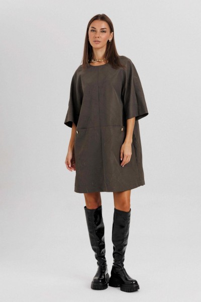 Платье имеет декоративные металлические элементы у линии карманов, что придает образу современный акцент. Универсальная длина до колена позволяет сочетать модель как с высокими сапогами, так и с ботильонами или обувью на плоской подошве.