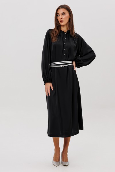 Платье из гладкого атласного полотна свободного рубашечного покроя. Модель выполнена с мягкой сборкой по горловине, застёжкой на пуговицы и объёмными рукавами на манжете. Акцентом выступают эффектные серебристые пояса, подчёркивающие талию и добавляющие образу современный, элегантный штрих. Ideal для деловых встреч, ужинов и особых выходов.