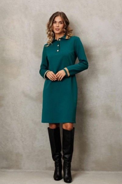 Платье слегка приталенного силуэта из плотного трикотажного полотна. Перед с застежкой поло и нагрудными вытачками. По воротнику и низу рукава настрочена декоративная тесьма.